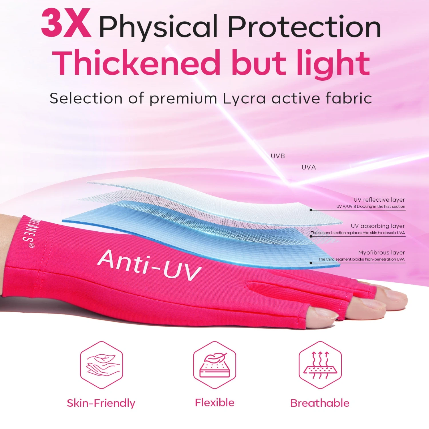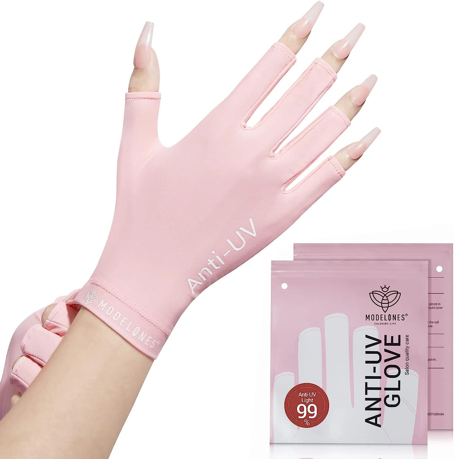 - UPF 99+ blocks 99% of UVA/UVB rays: Modelones UV Gloves for Nail Lamp are rated UPF99+ and are certified to block 99% of UVA and UVB rays, they shield your hands from harmful UV and LED lights produced by gel nail lamps, reducing the risk of skin damage, aging, and sunspots.