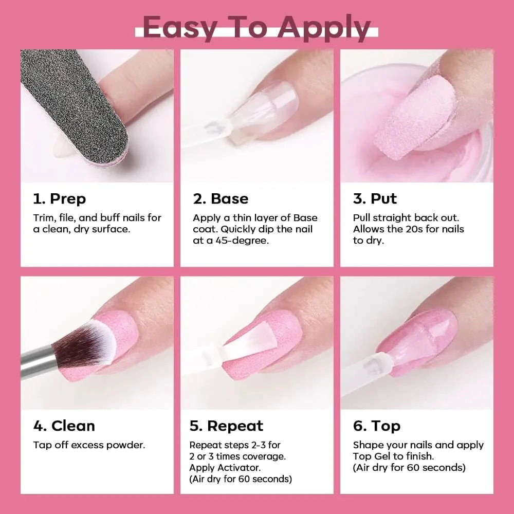 Step 2: Base Coat – Apply a thin Base Coat then dip into the shade of choice at a 45 degrees and tap off the excess dipping powder