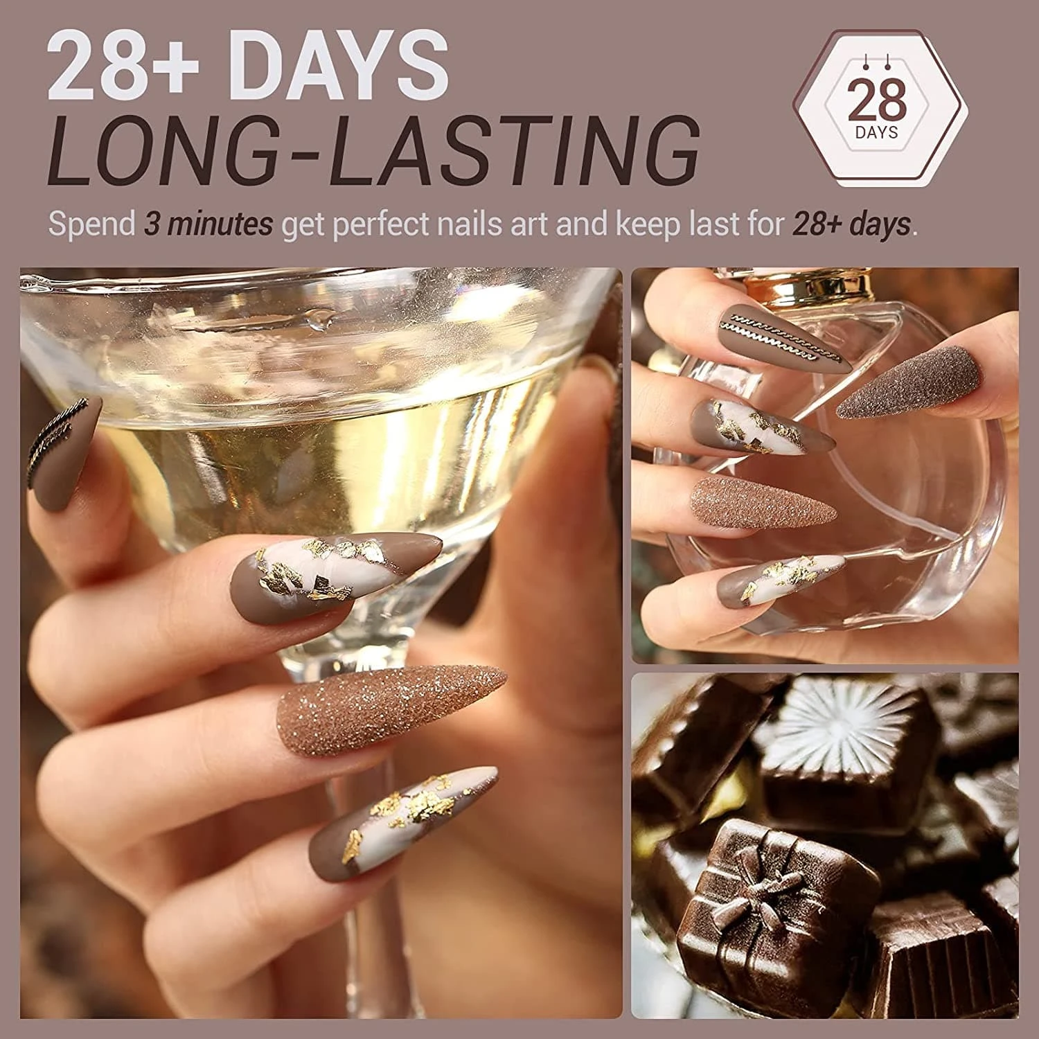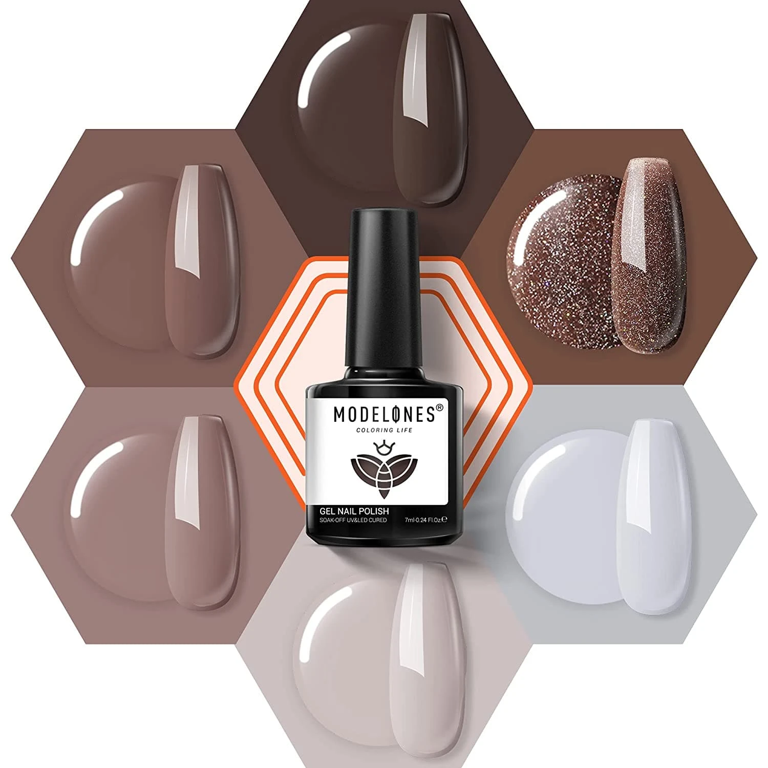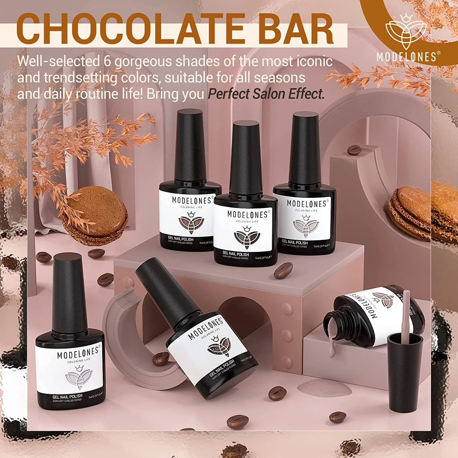 This “Chocolate Bar“ set of soak-off gel polish contains 6 shades of popular and trendy colors, suitable for all seasons and daily routine life.