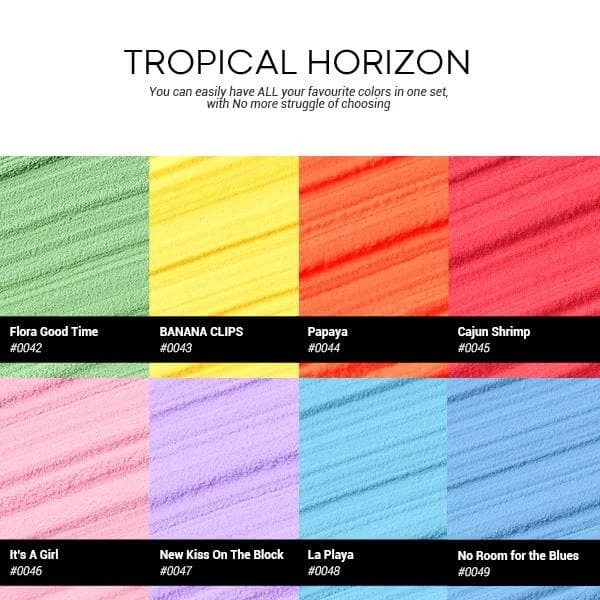 This “Tropical Horizon” set of dipping powder contains 8 shades of popular and trendy colors. With the rich color formula and lightweight texture, you can easily have ALL your favorite colors in one set, with No more struggle of choosing.